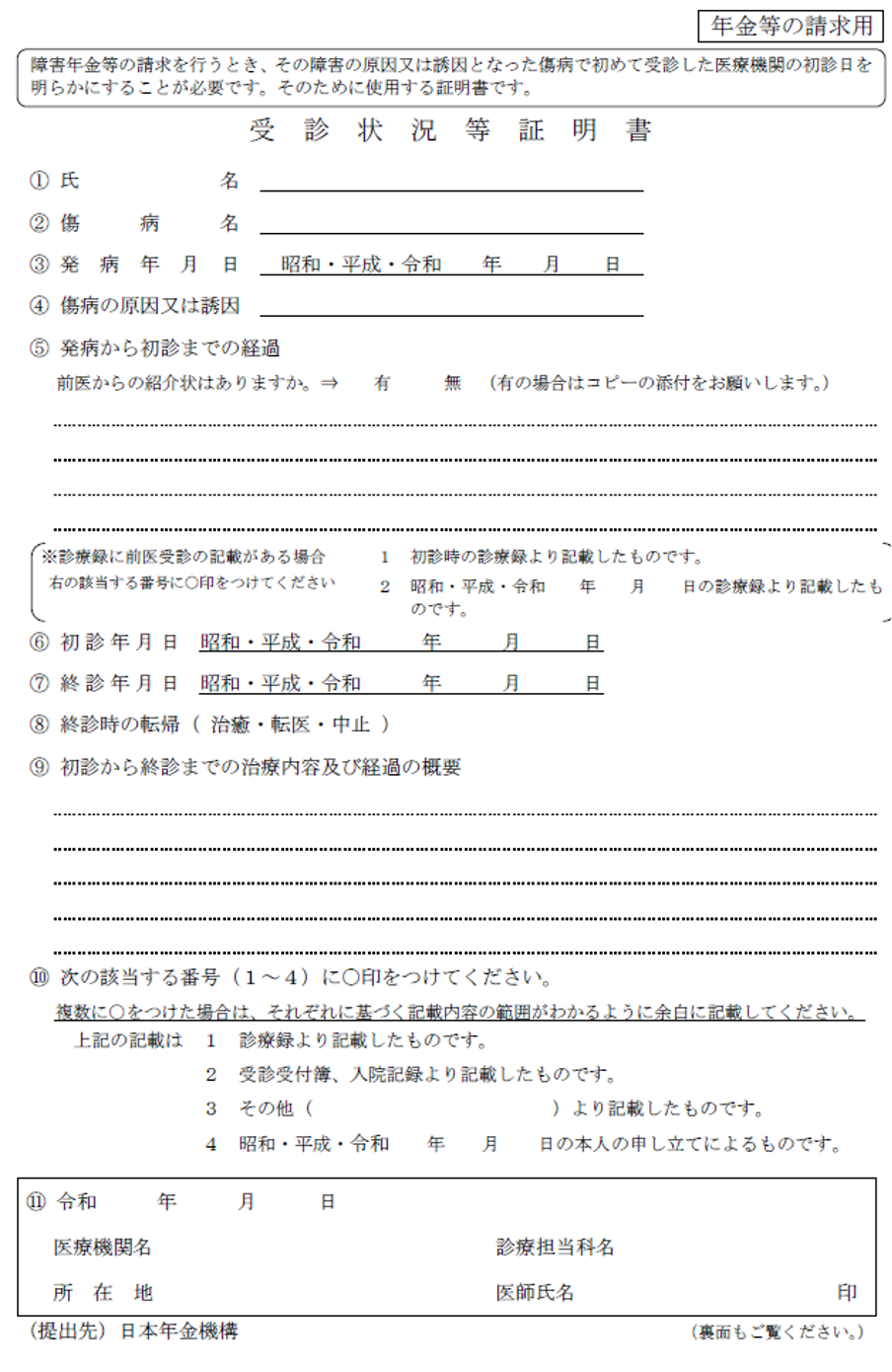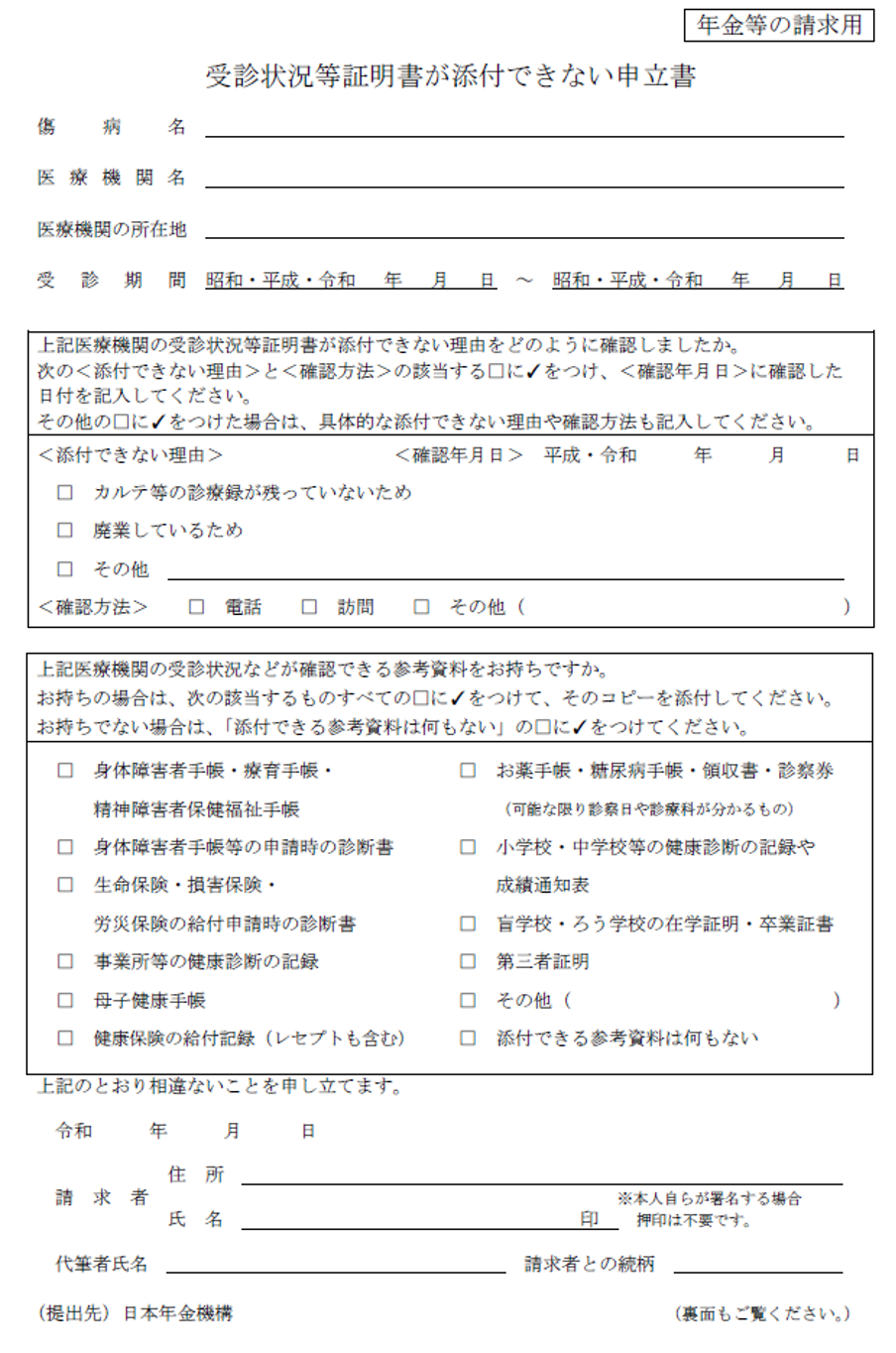 ただし、医師法でカルテの保存期間が5年となっていることから、初診が5年以上前の場合、初診の医療機関が廃院していた場合などは、受診状況等証明書が取れない場合もあります。その場合は「受診状況等証明書が添付できない理由書」付けて提出します。
