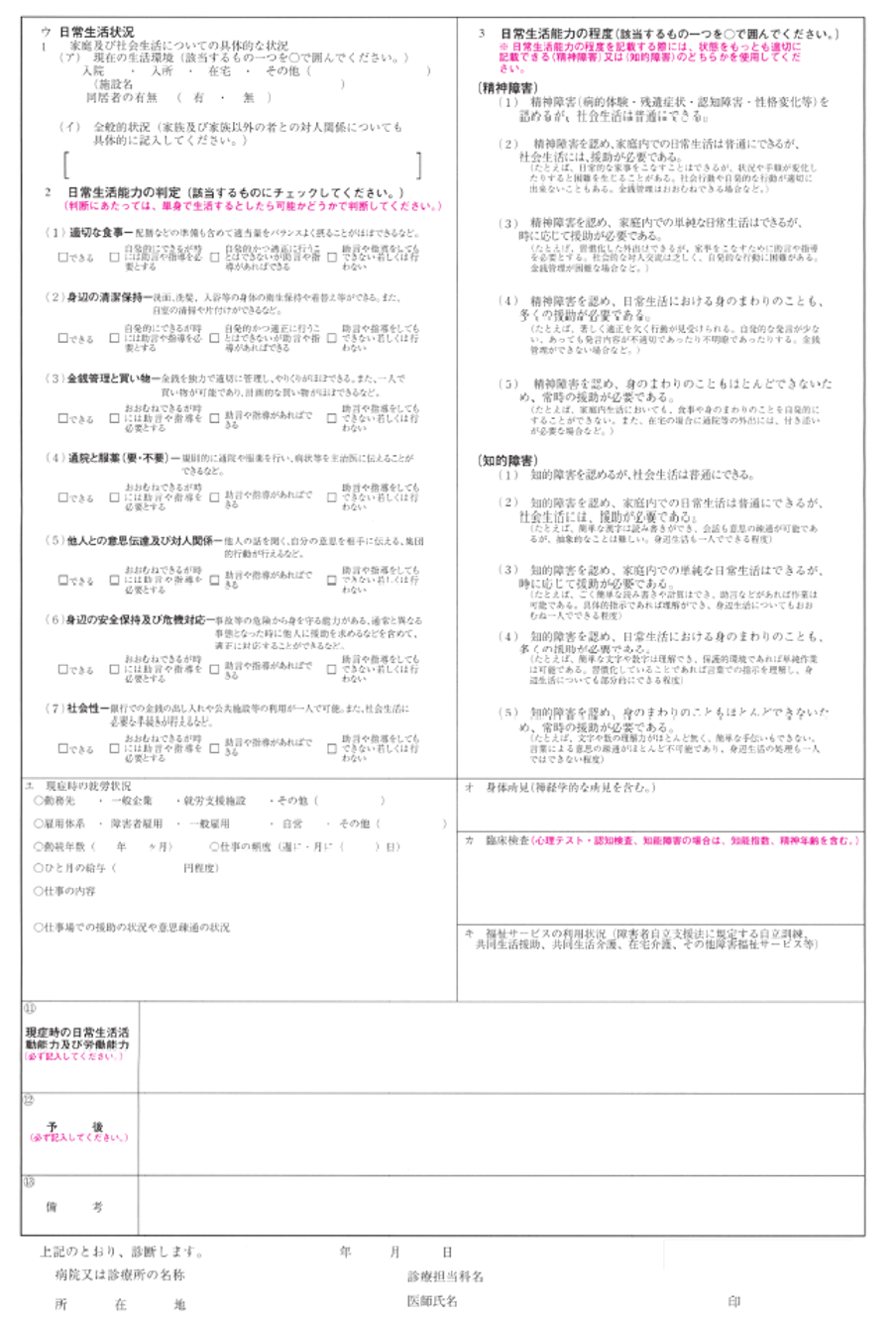 | ④精神の障害者用(様式第120号の4) | 知的障害、発達障害、統合失調症、うつ病、躁うつ病、高次脳機能障害、てんかん、老年および初老期認知症 など |
