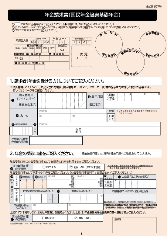 年金請求書は「障害基礎年金」用と「障害厚生年金」用とに分かれます。両者の違いは、障害厚生年金では2級以上の場合配偶者加給年金が支給されますので、配偶者に関する詳しい情報を記載するようになっています。
